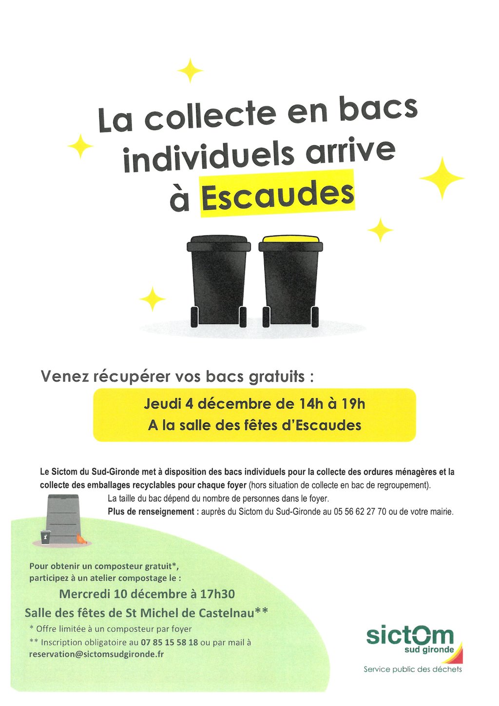 Si vous souhaitez obtenir un composteur gratuit, vous pouvez assister à l'atelier compostage qui se déroulera le mercredi 10 décembre 2025 à 17 h 30 à la Salle des Fêtes de Saint Michel de Castelnau.